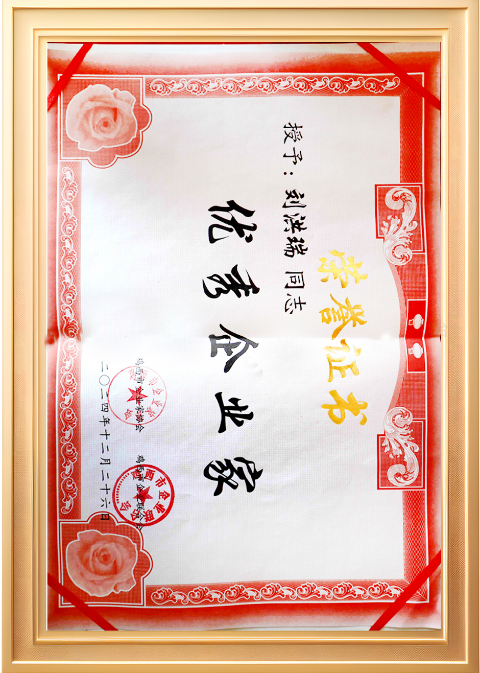 雞西市企業(yè)家協(xié)會授予劉洪瑞先生“雞西市優(yōu) 秀企業(yè)家”稱號